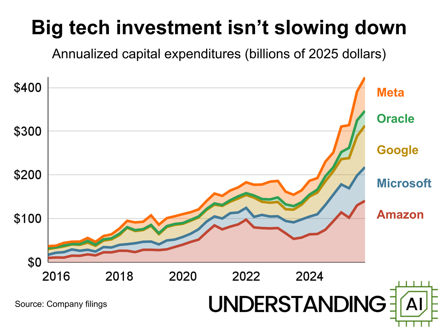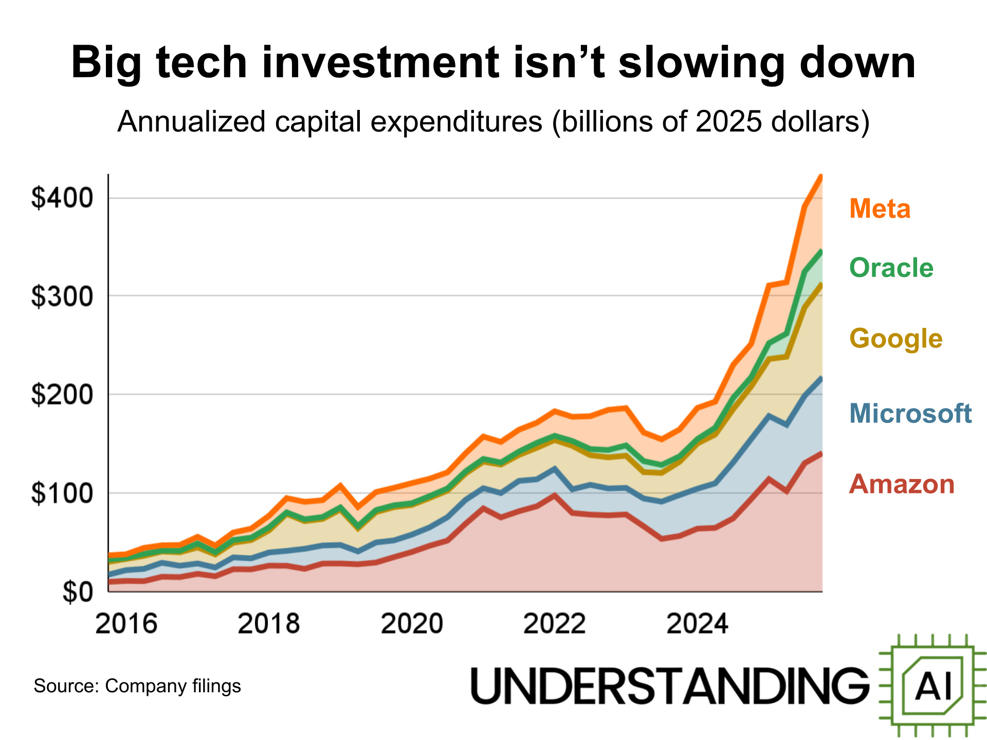 Five of the largest hyperscalers—Alphabet, Microsoft, Amazon, Meta, and Oracle—spent a combined $106 billion on capital investments in their most recent quarters. This was the first time those companies have spent more than $100 billion in a single quarter. It was 9% more than last quarter and a whopping 73% increase from a year earlier.