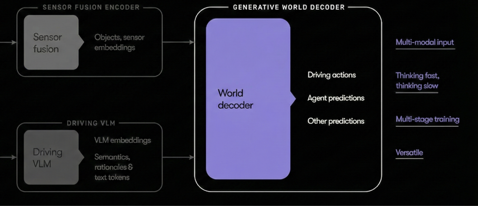 It takes inputs from both the sensor fusion encoder (the fast-thinking module that breaks the scene into individual objects) and the driving VLM (the slow-thinking module that tries to understand the scene as a whole). Based on information supplied by these modules, the world decoder tries to decide the best action for a vehicle to take.