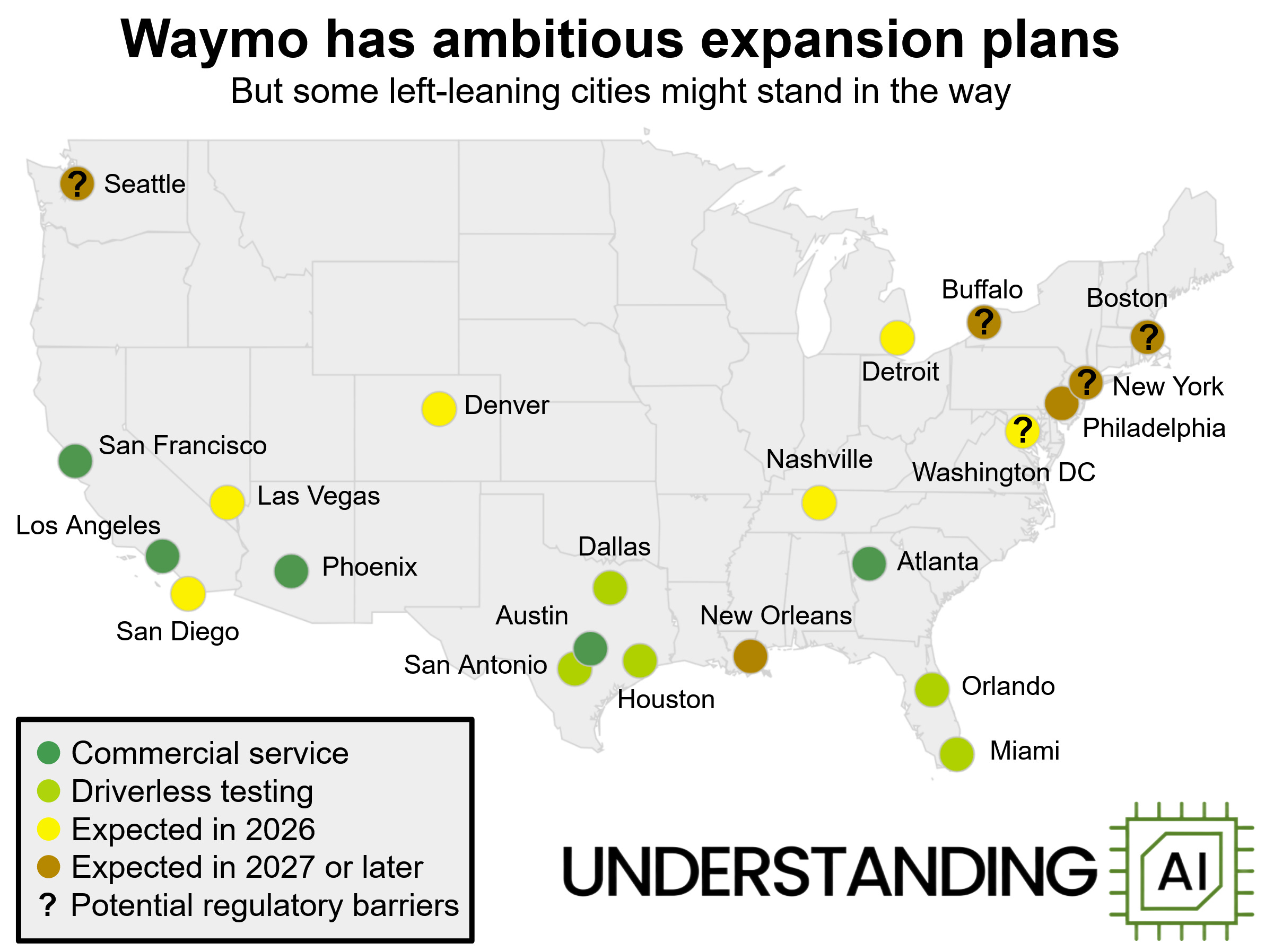 Three purple states — Michigan, Nevada, and Pennsylvania — also have favorable laws. This may allow Waymo to expand to Las Vegas and Detroit in 2026 and Philadelphia soon after that.