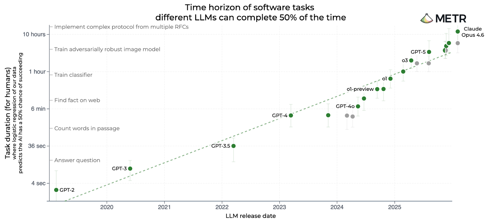 Measuring tasks this way gives us a way to compare models with dramatically different capabilities. GPT-2 could only complete tasks that took human programmers about two seconds, whereas GPT-5 could complete tasks that took around 3 hours of human effort. So we could say that GPT-5 could complete tasks that are 5,400 times “harder” than the tasks GPT-2 could complete.