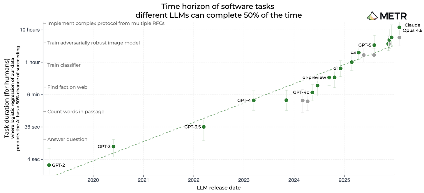 I think this chart — and especially the impressive score for Claude Opus 4.6 — has done a lot to foster an impression of accelerating AI progress in recent months. Notice that the chart is logarithmic, so a straight line indicates exponential progress. The fact that Claude Opus 4.6 is above the previous trend line suggests very rapid progress indeed.