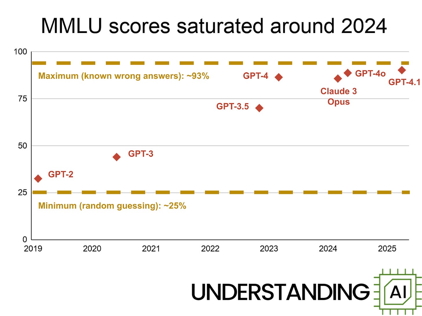 By the time I started writing about LLMs in 2023, GPT-4 had scored 86.4%. GPT-4o scored 88.7% in 2024, and GPT-4.1 scored 90.2% in 2025.